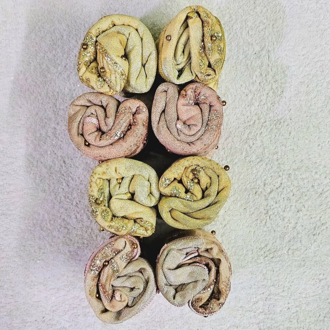 The Regal Grace Hijab is a show-stopping accessory designed for weddings and special occasions. Adorned with intricate gold and rose gold embellishments, this hijab exudes luxury and sophistication. Its slightly textured fabric adds structure and elegance, making it perfect for creating a grand, regal look.